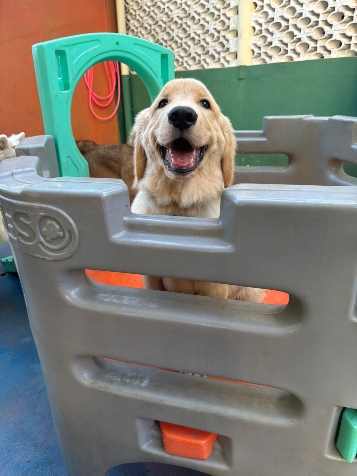 Na creche, o cão brinca, corre e interage ao longo do dia.